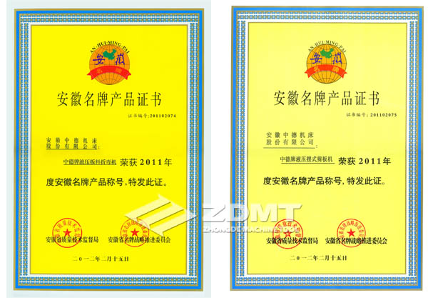 2012年3月22日,马鞍山市召开了全市品质手艺监视任务集会,集会对2011年取得质监部分相干声誉的企业与小我停止了惩处,我公司中德牌液压装置摆式数控剪板机和中德牌夜压板料折边机两个产物别离经由过程了2011年“安徽名牌”的复审。